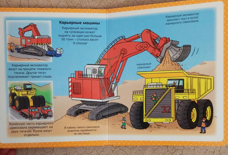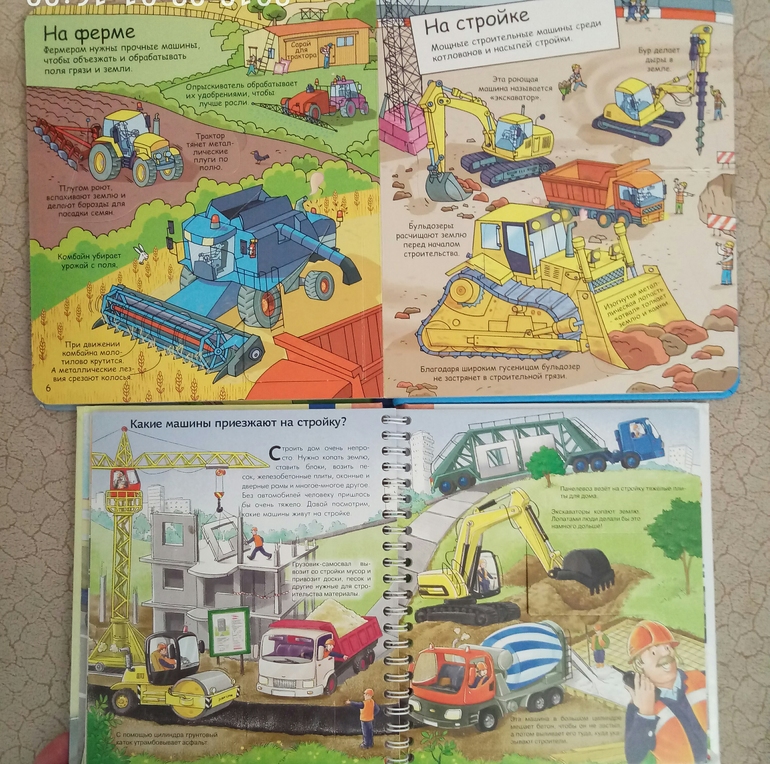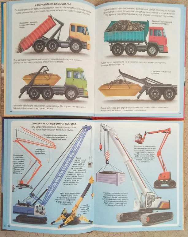 Самой первой у нас появилась энциклопедия Машины на стройке от издательство Махаон. Как раз вариант для самых маленьких, пухлая обложка, плотные картонные листы. Про эту серию много хороших отзывов, и я тоже думала купить несколько, но вот у нас книга хитом не стала, хотя и издана отлично и по содержанию очень достойная