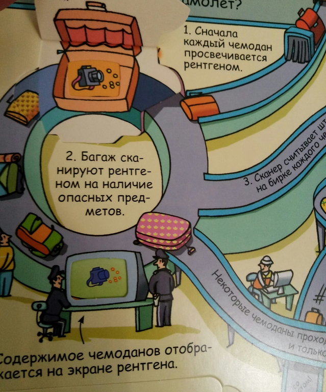 Недавно рассматривали Аэропорт, изучали разворот , где багаж сдают, можно прокрутить, посмотреть что в чемоданах лежит, и обнаружили, что при прокрутке и на экране и в чемодане одинаковые вещи показываются) раньше не обращали внимания, крутили и крутили) подробнее показывала тут