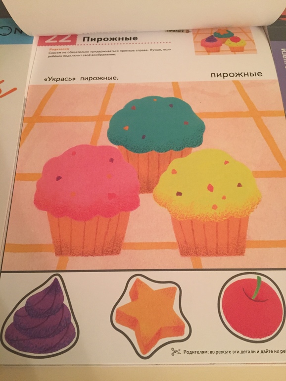 Рабочая тетрадь "давай клеить" содержит в себе нескольк листков с наклейками, остальные детали надо вырезать или ребёнку предлагается разорвать на кусочки и приклеить. Есть задания по принципу "наклей заплатку", "укрась/добавь/положи" и по принципу "приклей детали, чтобы получилось". Моим девчонкам явно не хватило готовых наклеек))))