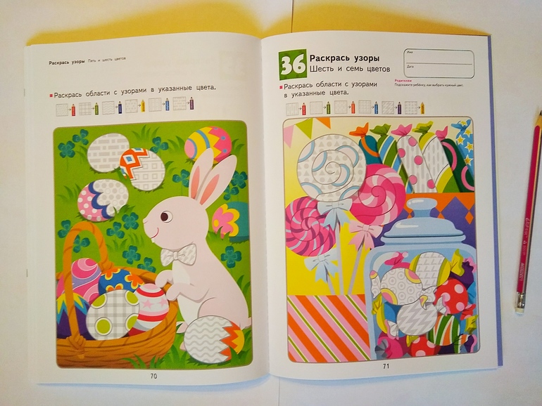 О сложности упражнений. Если судить по моему ребенку - то ей заданий как раз в самый раз на возраст 4,9 года. Т.е. я бы советовала приобретать эти пособия детям возрастом 4-5 лет. Некоторые первые (и самые простые) задания в каждом разделе - не состявит труда выполнить даже трехлетке. Но не все. Раздел "Раскрась узоры" - вообще не понятно, почему оказался в этой тетради. Развития пространственного мышления я тут не вижу.