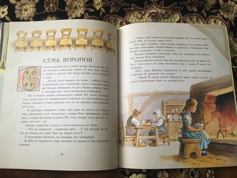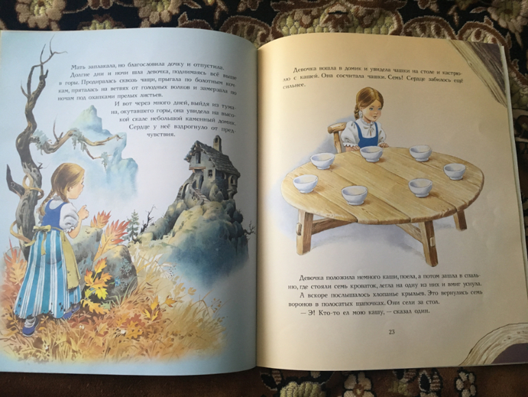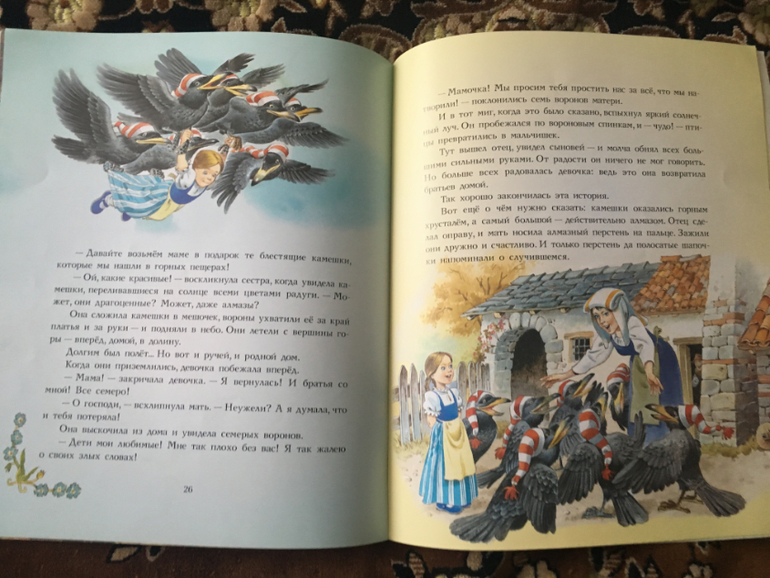6) Эту книжку купила пару лет назад на книжном развале возле метро за 40 (!) рублей. Иллюстрации очень красивые! Сказку Семь воронов в детстве не читала, а Даше она больше всех понравилась. Ее и показываю: