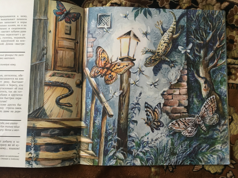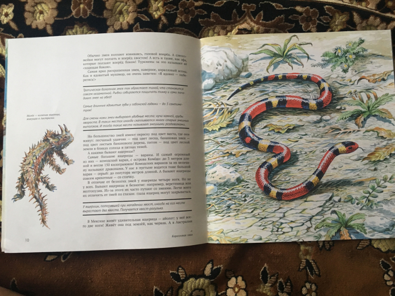 Ну и последняя. Про животных Даша любит, мы обычно и фото, и видео про них смотрим дополнительно. Про рептилий прочитали с интересом, сейчас часто вспоминаем об этой книге в контексте каких-то занятий, мол, помнишь, мы читали про эту ящерицу? Очень реалистичные и большие картинки, это огромный плюс этой книги.