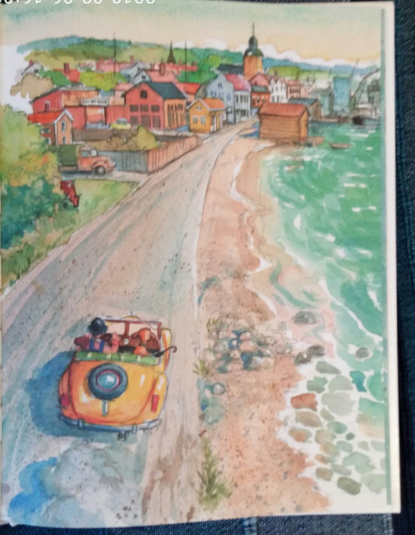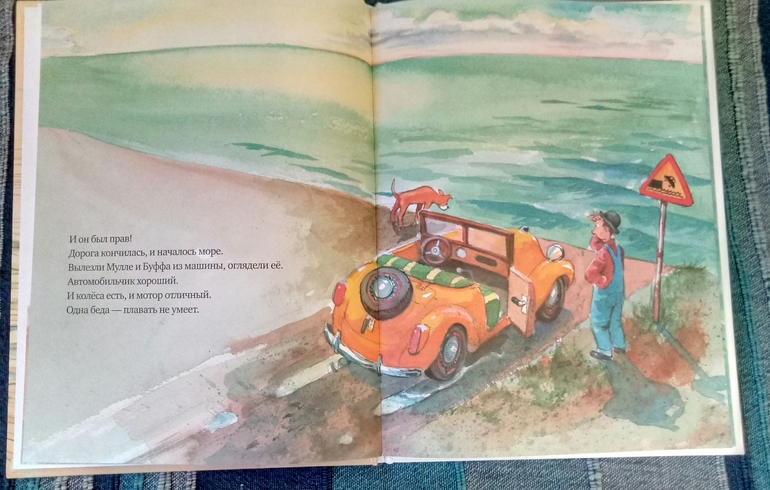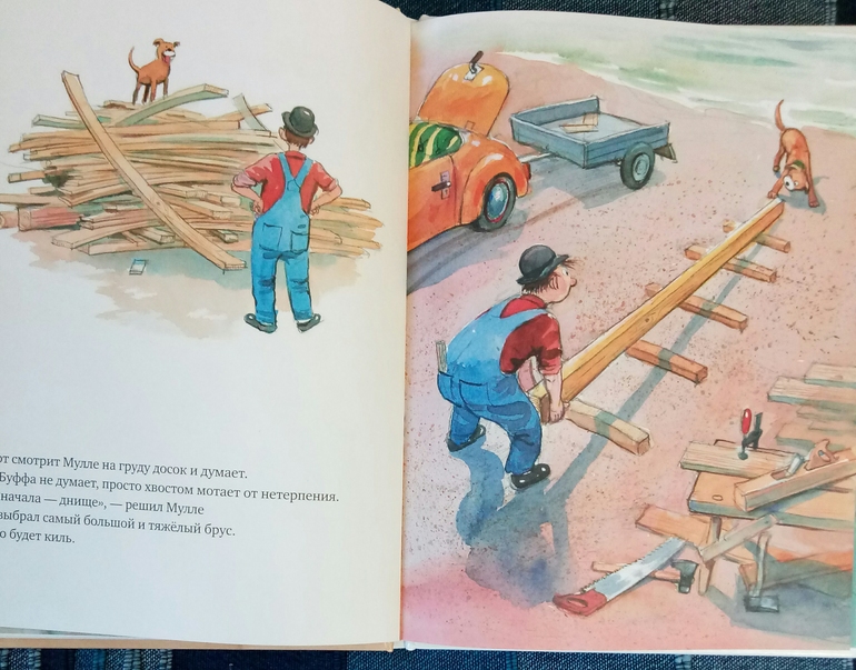 Вот и вторая книга Мулле мек строит лодку начинается опять таки с машины, на которой наши друзья доехали до море, и все, дальше стоп, какая бы машинка не была замечательная, плыть она не умеет...