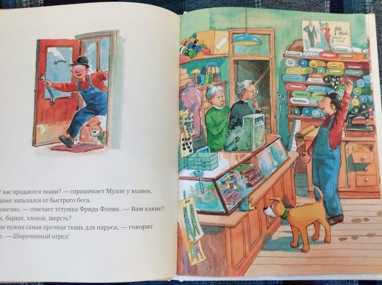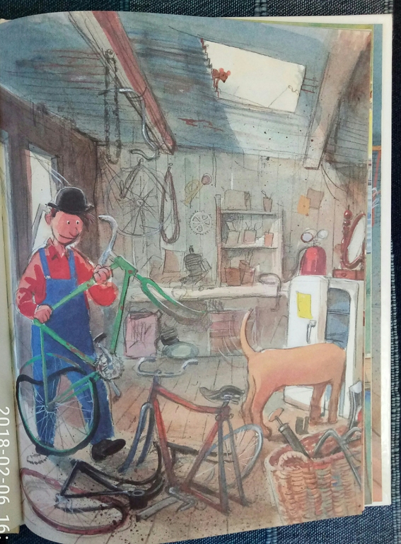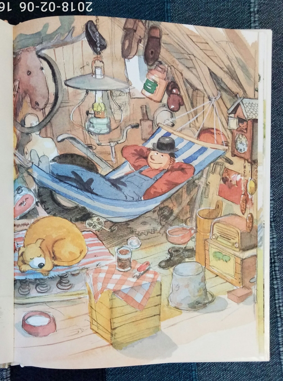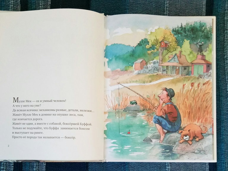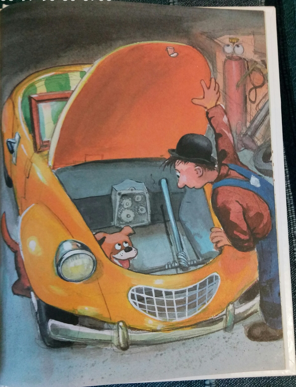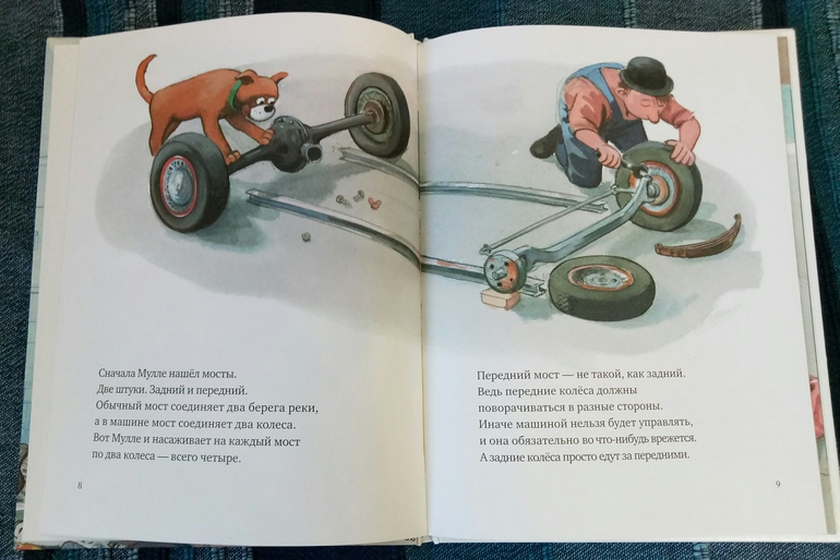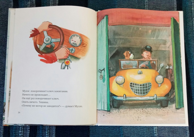 Надо сказать, это не первое знакомство, я уже брала полгода назад в библиотеке первую книгу про автомобиль, но мы ее не только не читали, мы ее даже не просматривали толком, не вызвала совсем интереса.. но после просмотренных топов за 2017 год я решила, что все таки надо дать книгам второй шанс) и вот 7 января мы с сыном потопали в пункт самовывоза, где нас на второй этаж не хотели пускать, со словами, там все закрыто, но на мой возглас как же лабиринт, ответили, аа, эти да, работают) И со второй попытки это оказалась любовь с первого взгляда, с первой странички. Итак, в первой части мы знакомимся с этим изобретательным и умелым человеком Мулле Меком и его собакой, между прочим, боксершей, Буффой