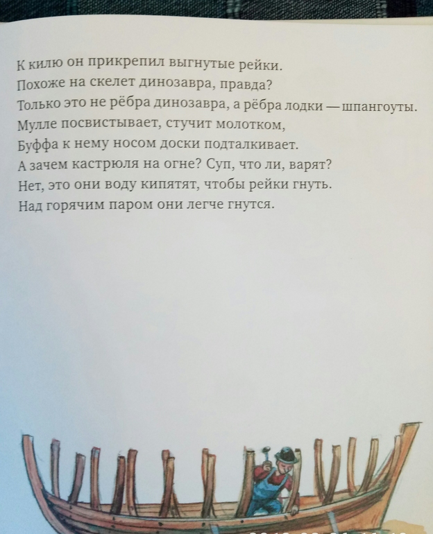Процесс постройки описан опять таки подробно и очень доходчиво) от днища с шпангоутами, до паруса и руля) вы не знаете, что такое шпангоуты?) а я вот уже знаю, это ребра лодки) и гнуть их, оказывается, легче под горячим паром)