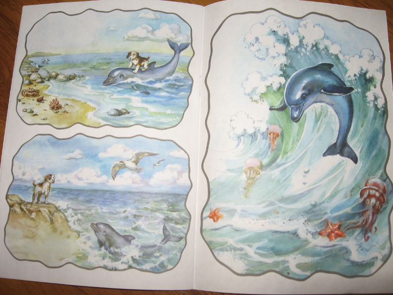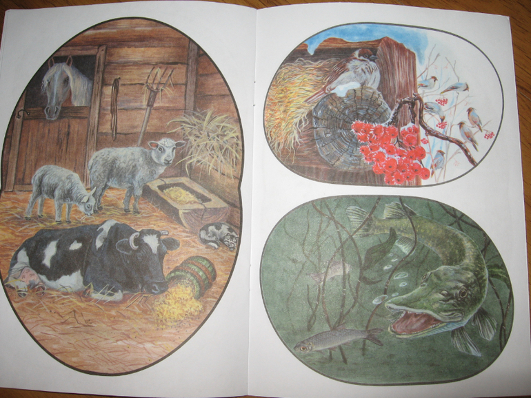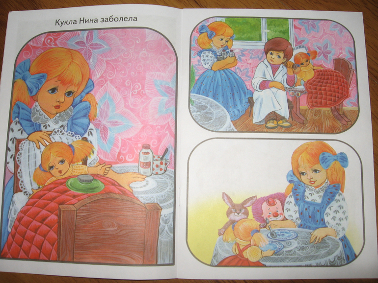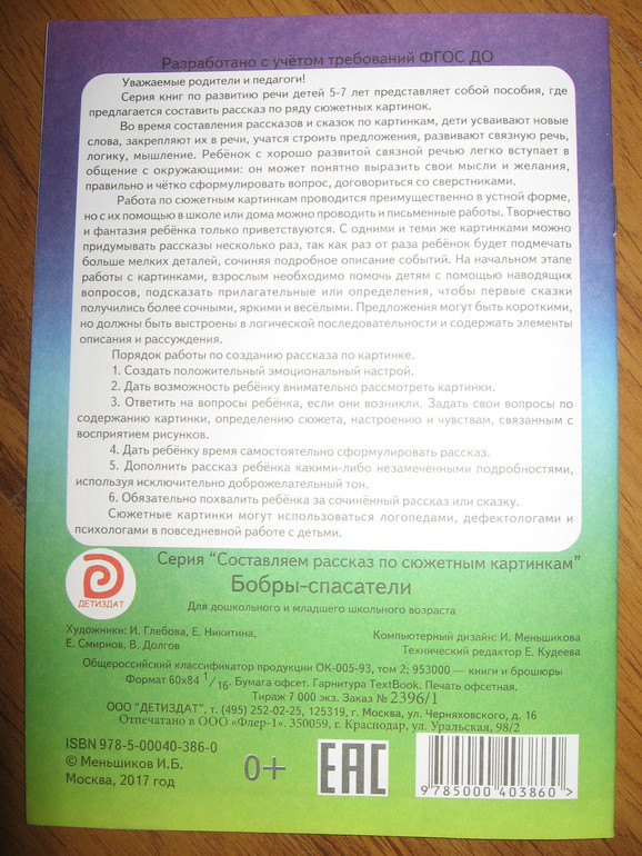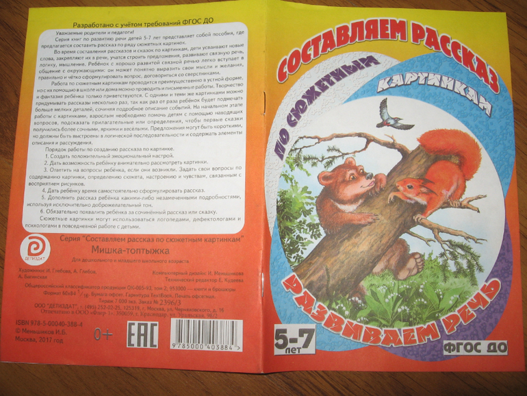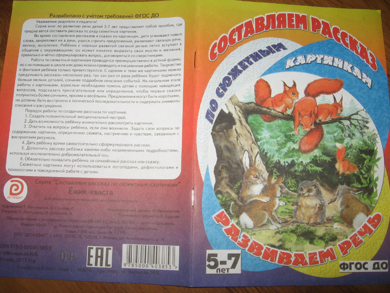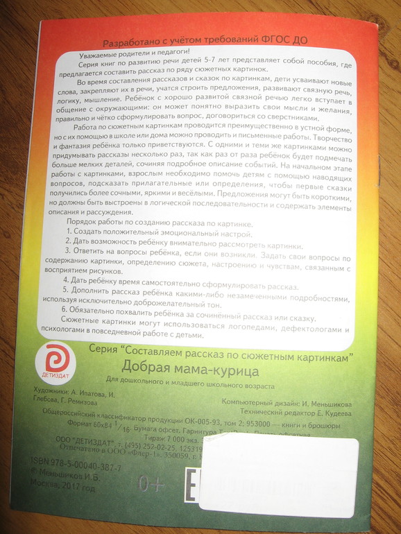 По соотношению цена-качество книги вполне себе приличные. Формат книги чуть уже тетрадного, бумага белая и достаточно плотная. Текста в книге, кроме заголовков, нет совсем, только сзади на обложке небольшая заметочка для родителей и педагогов с описанием того, как можно работать с книгой. Объем книги - 16 страничек, в каждой для работы предложено по четыре сюжета (в одной правда целых пять). Могу ошибаться, но скорее всего картинки взяты из художественных книг, которые этим же издательством выпускаются. По крайней мере, встречала пересечения при просмотре их продукции. Но все рисунки приятные. Мы с Алисой пока по книгам особо не занимались, просмотрели только картинки, но она любит сама рассказывать истории (она это неплохо и с обычными книгами делает), поэтому покупкой довольна на все 100%.