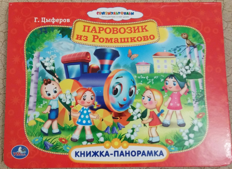 Книжка панорамка издательства УМКа серия Союзмультфильм Паровозик из Ромашково Г. Цыферова. Это просто шикарные панорамки по нашим замечательным мультикам, у нас уже три штуки, и четвертая в самовывозе) хотя я планировала только две, и остановиться) но как тут остановиться) качество отменное, загругленные уголки, ламинированные картонные листы, но порвать при желании, конечно, можно.. и текст вполне связный и читаемый.