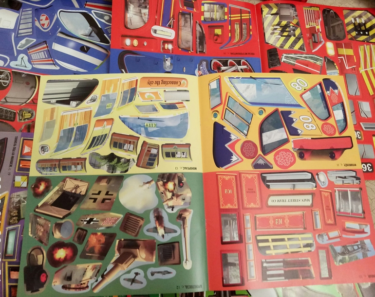 Мы их уже вытащили из середины книги, для удобства пользования, и хотя они и смотрятся художественным беспорядком, пользоваться очень удобно, все подписано,и название транспорта и к какой странице наклейки.