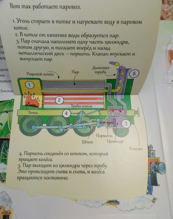 Есть и небольшой словарик терминов, где объясняется несколько самых употребляемых слов: поезд, дизель, локомотив, груз, котел, лошадиная сила, воздушная линия электропередачи.