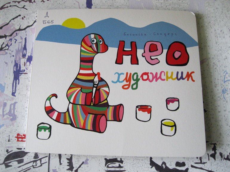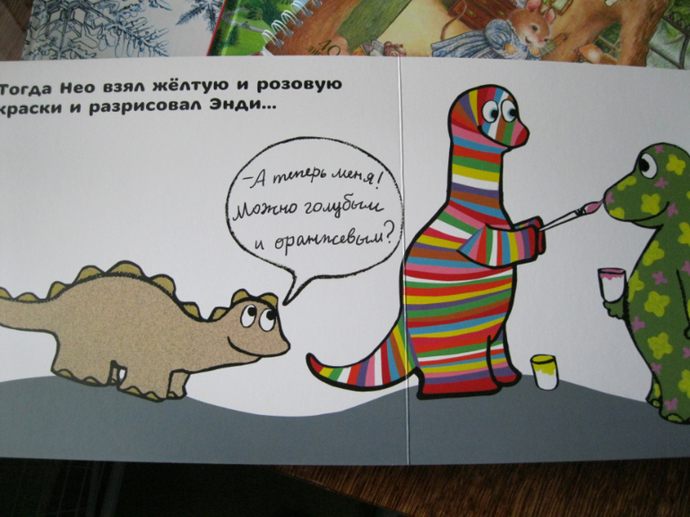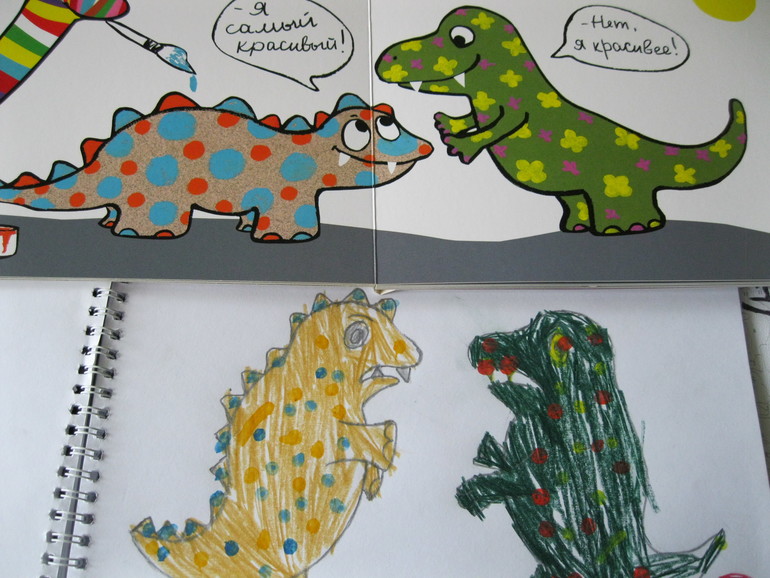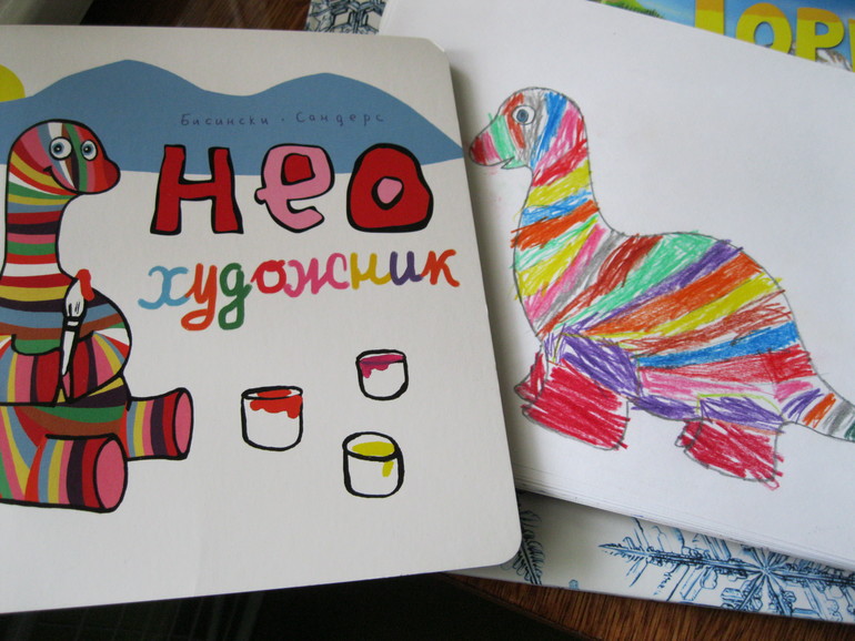 Между прочим, белорусское издательство "Открытая книга" (я своим всегда рада, а достойным своим - вдвойне). Издание добротное, хороший такой картон, закруглённые уголки - сделано с любовью и для малышей. У них там целая серия книг вышла про Нео. Нам уже покупать поздновато, но мы с удовольствием почитали про этого яркого динозаврика (читали правда напополам: Костя - печатный шрифт, я - "рукописный") и нарисовали его (папа нарисовал, Костя раскрашивал).