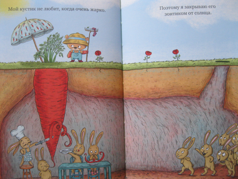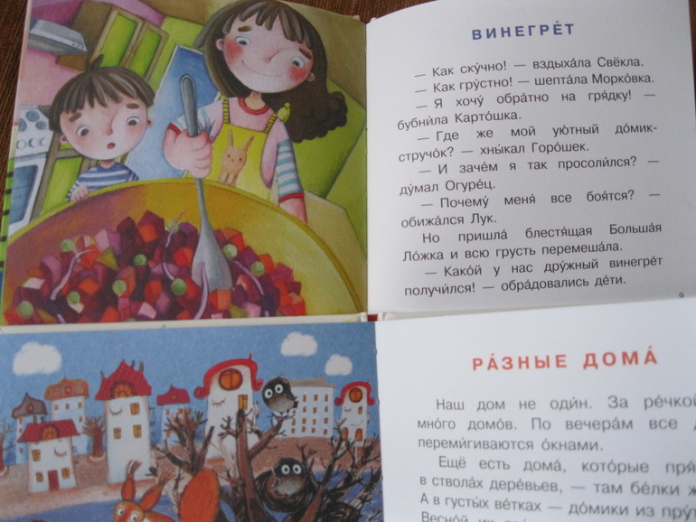 1-2 строчки текста над картинкой - это нам подходит. И даже отсутствие ударения не испугало читателя (хотя с ударениями как-то попроще Косте, вот деление на слоги в его случае совсем не обязательно). И сама история нам очень понравилась. И Костя даже надеется, что морковка - немножко роза))