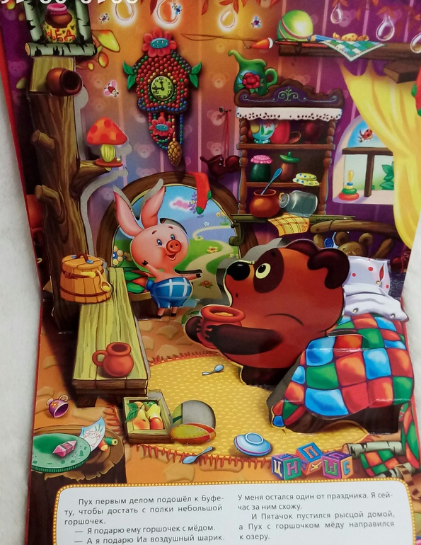 Причем у нас и пазл, и панорамка по этой части, но текст разный) все таки в панорамке более полный, есть и фразочки из мультика : если оно вообще доброе, Пух, это же твой дом, пря здря вля ю сдине мраш деня!жела- жила- желаю .. и так далее. И читаются они с мультяшной интонацией)