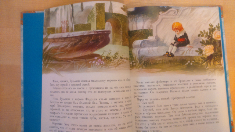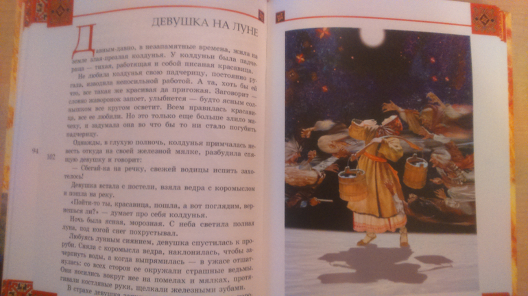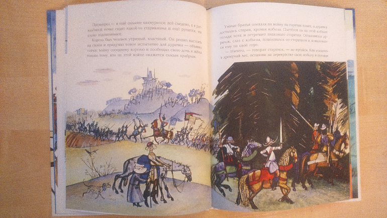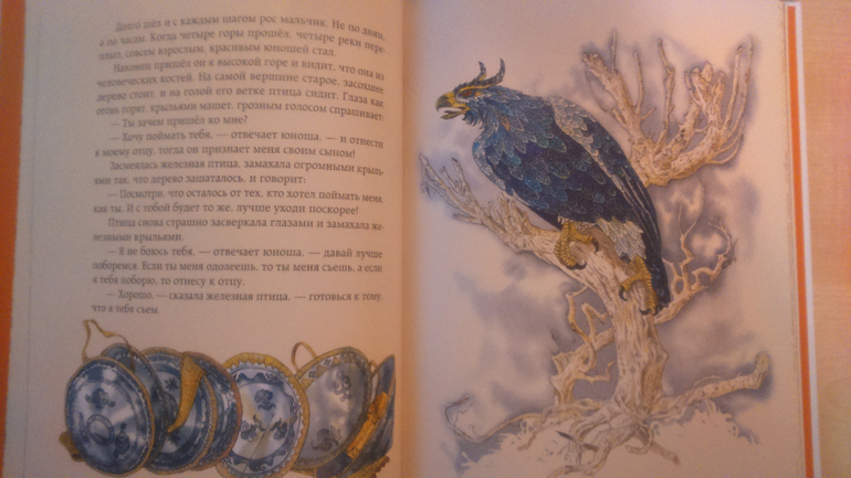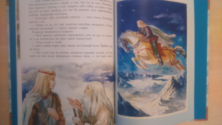 Здесь, в отличии от первой, иллюстрации Павлишина на каждом развороте плюс на целый разворот без текста. Книга волшебная, открываешь, так и тянет почитать)) Я еле оторвалась от сказки, хотела чуть-чуть, чтобы понять не порали со Святославом почитать. И прочитала первую сказку. Святославу рано, лет с 5, наверное, подойдёт.