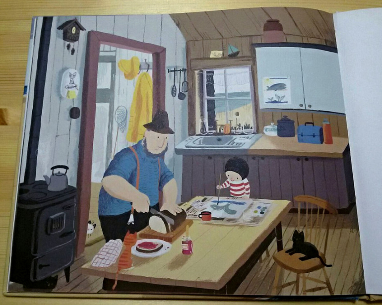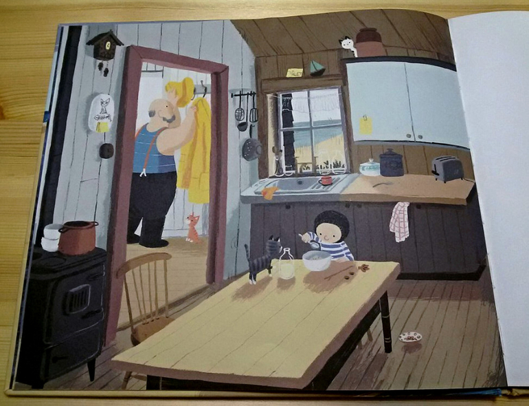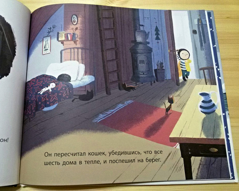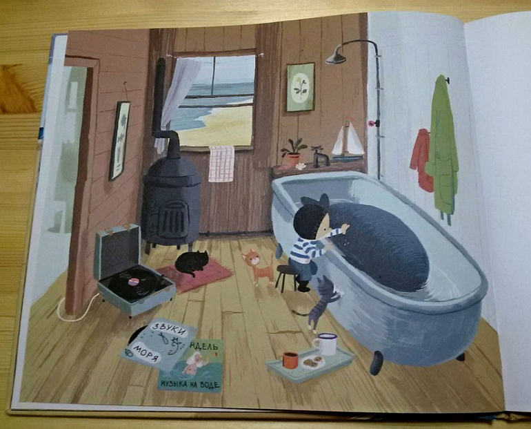 Дальше мы надолго зависли над картинкой, выискивая и считая всех четвероногих. Конечно, дело бы шло быстрее, но мне было строжайше запрещено помогать. И только найдя всех котов, мне разрешили продолжить чтение. Правда, опять ненадолго, потому что мы останавливались почти на каждой странице и считали всех котов, которых нам удавалось найти. Сын очень огорчался на разворотах без домашних любимцев и даже кит не спасал положение.
