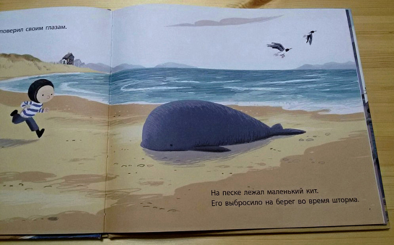 Текста в книге мало, сюжет простой - мальчик спасает кита, потом они вместе с папой отпускают его обратно в море. Это становится началом новой дружбы, про которую речь пойдет уже во второй книге. Но при этом первая часть вполне самостоятельна и закончена. Она оставляет читателя в надежде на то, что друзья скоро встретятся вновь.