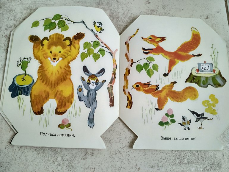 Только спустя неделю были прочитаны Часы! Иллюстрации Андрея Брея очень и очень понравились дочке, все животные были тщательно рассмотрены, названы, озвучены их действия. Особой популярностью пользуется лягушка! На каждом развороте мы её находим и следим, что же она делает!!
