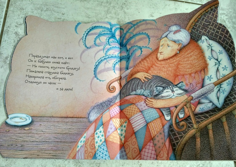 Как только "Часы" понравились, Даша разрешила почитать ей Как Кот стал Котом Котофеичем. И хотя у нас есть это стихотворение в сборнике "Мозаика" с иллюстрациями Калаушина, я все таки купила его отдельной книгой. Потому что наш любимый формат чтения на данный момент это одно длинное стихотворение на всю книгу, по несколько строчек на развороте и подробные иллюстрации происходящего. И эта книга стала любимой. Милый кот, которого бабушка выгнала из-за его лени симпатичен дочке, и она очень переживает, что он теперь будет жить на улице :