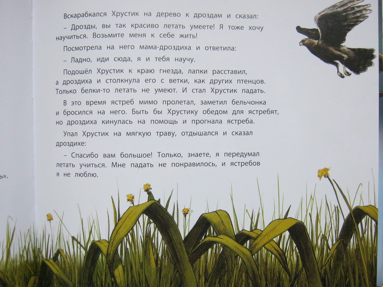 Собрался было стать дроздом, да чуть не утащил его ястреб. (Вот тут очень сомнительным мне кажется эпизод, когда мама-дроздиха прогнала ястреба... ладно бы еще отвлекла, чтоб бельчонок смог спастись, но нет, именно прогнала)