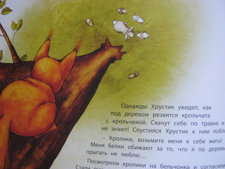 История про самого младшего в большой семье и самого нерешительного бельчонка Хрустика. Побаивающийся прыгать по веткам бельчонок, не вынеся насмешек старших братьев и сестер, решил уйти жить к кроликам