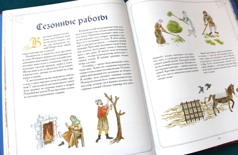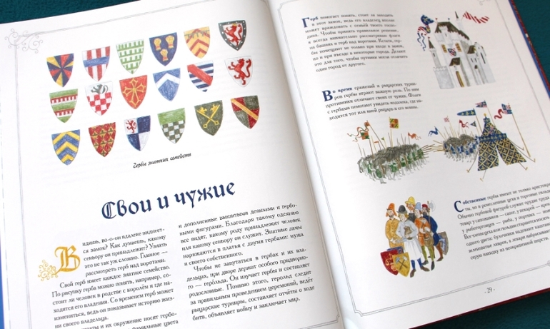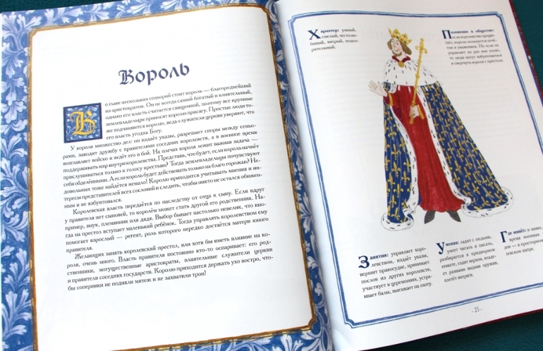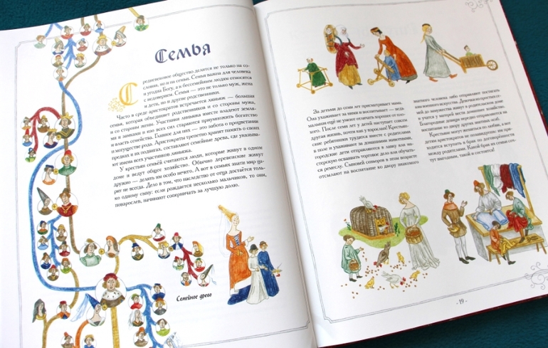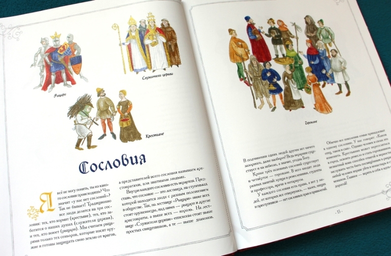 Я прочла с десяток глав (глава на разворот) - никаких дат, имен, читается как сказка. И каждая сказка раскрывает какое то понятие в рамках средневековья - король, менестрель, крестьянин, жизнь крестьянина, город, городская жизнь, аристократы, сословия, врачевание, купец - всего 45 понятий. Такое интересное погружение в средневековье без груза исторических личностей.