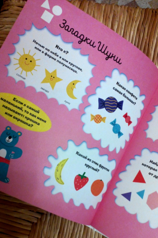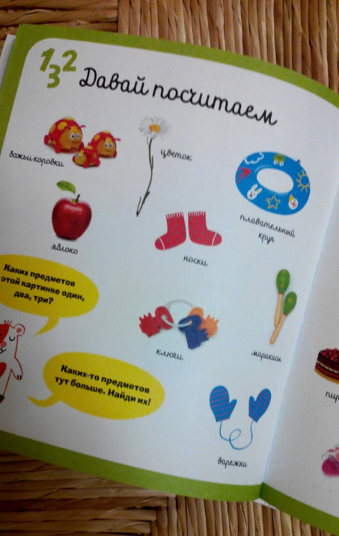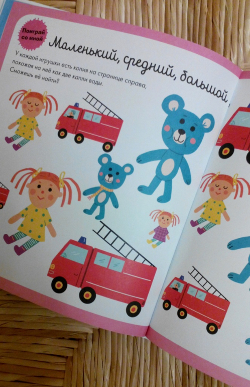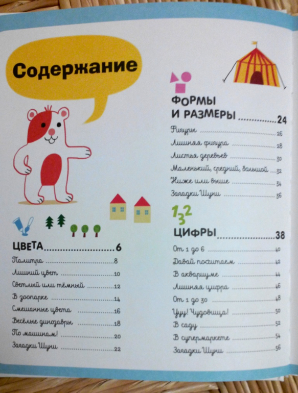 Книга замечательная и полезная, для детей от 2х до 5ти лет. Нам чуть-чуть до двух, заниматься мы уже начали: изучаем цвета, формы, понятия "высокий-низкий", "маленький-средний-большой", считаем понемногу. Книга яркая и весёлая. Некоторые странички приходится перелистывать в виду их сложности, чтобы вернуться к ним вновь. Например, смешение двух цветов для получения третьего. Тема "Цвета" самая легкая и самая первая и логично, что страничка "Смешанные цвета" в начале книги, но 2х-летнему малышу это пока рано изучать, на мой взгляд, поэтому вернемся к ней позже. Равно, как и форма листьев деревьев в теме "Формы и размеры". Дождемся, когда листья на деревьях вырастут, и займемся ботаникой). Эти моменты я недостатками не считаю, - книга разбита на темы, темы расположены в порядке усложнения, но и в простых темах есть более сложные странички, так даже интереснее.