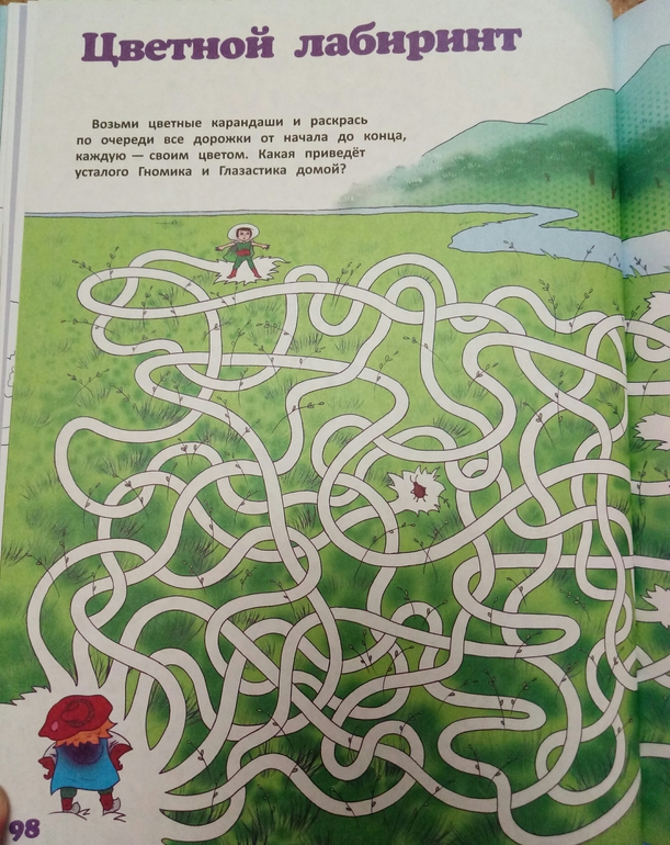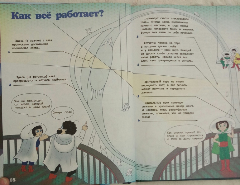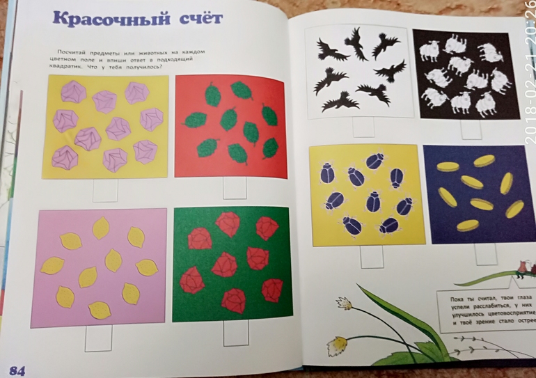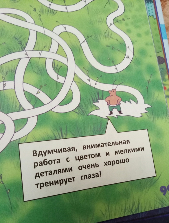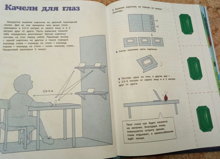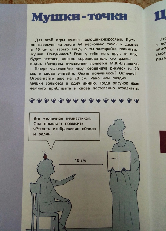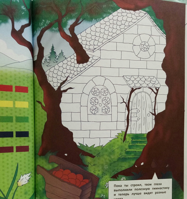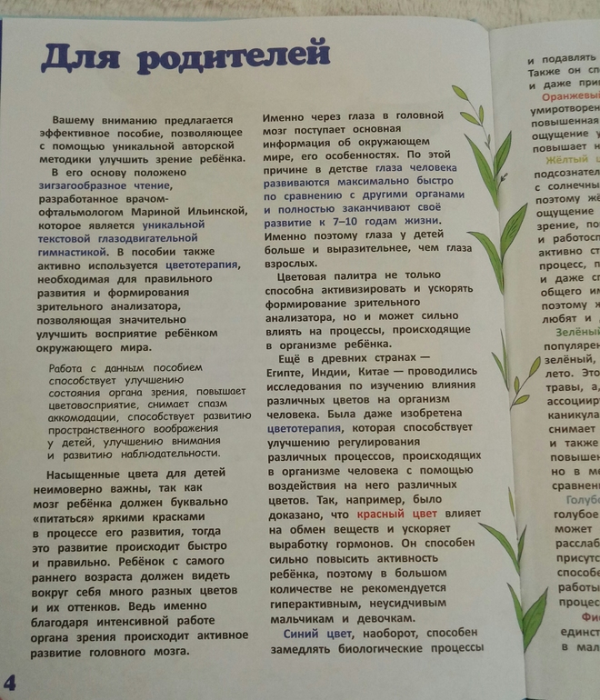 Книжка большего формата издательства Эксмо из серии Хочу все знать про здоровье. Автор Ильинская Марина, врач врач офтальмолог,создатель Центра эффективной офтальмологии. В книге используется ее личная методика с использованием зигзагообразного чтения и цветотерапии. Это оказалась не просто энциклопедия с примерами упражнений для глаз, это еще и творческая тетрадь со связным сюжетом и интересными заданиями, полезными для зрения. Нужно будет рисовать, раскрашивать, придумывать, и даже вырезать. После каждого задания написано, что же тренировали и развивали, и это очень мотивирует) приятно же осознавать, что не просто задания выполняешь, а еще и развиваешь цветовосприятие, пространственное воображение, и делаешь полезную гимнастику для глазок.