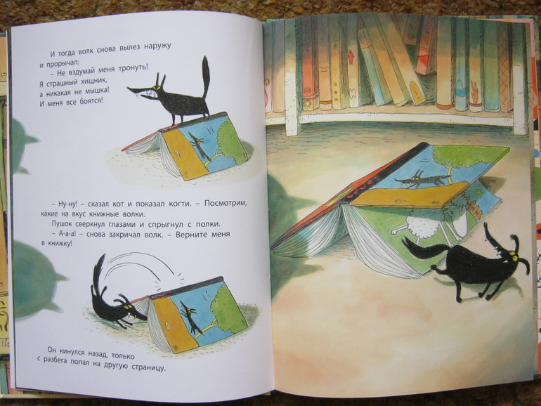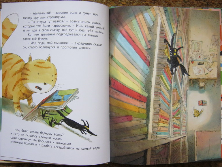 Поскольку волк так здорово замаскировался и, будучи нарисованным, прилично уменьшился в размерах, то громаааадный по сравнению с ним кот принял его за мышку.