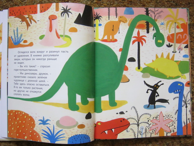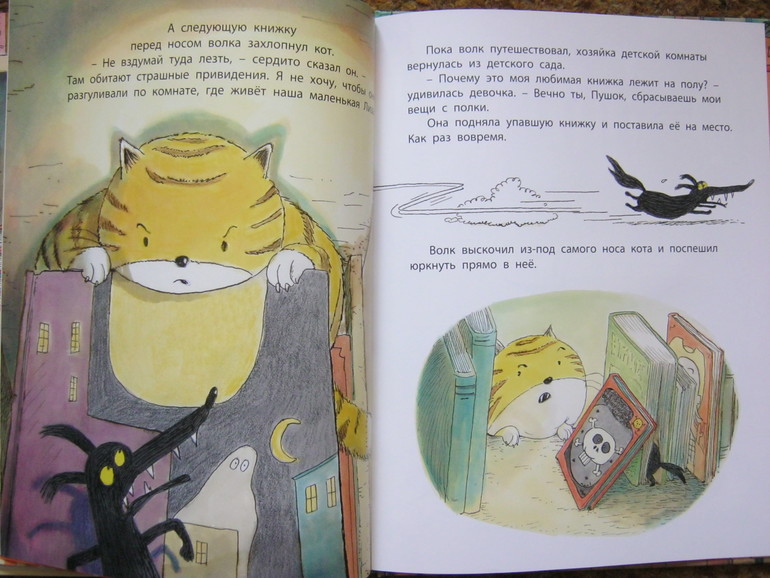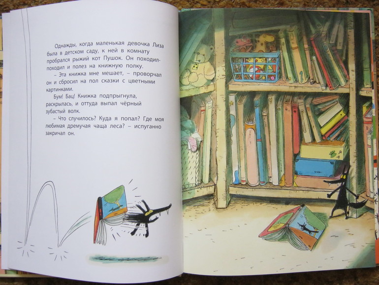 Сюжет прост - пока девочка Лиза была в детском саду, по книжным полкам в ее комнате лазил кот и уронил на пол книжку, из которой выпал волк - вот это черное, не похожее на себя, зубастое страшилище - помесь таксы с крокодилом, видимо, перед тем как попасть в книгу, пролезшее через печную трубу.