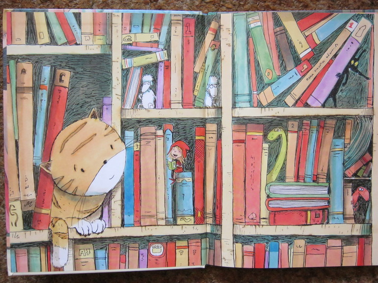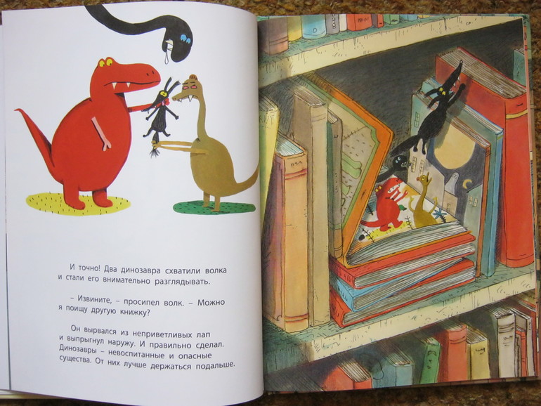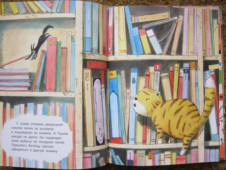 Он бегал с полки на полку, иногда залезая в книжки, надеясь найти свою, но попадал совсем не туда...