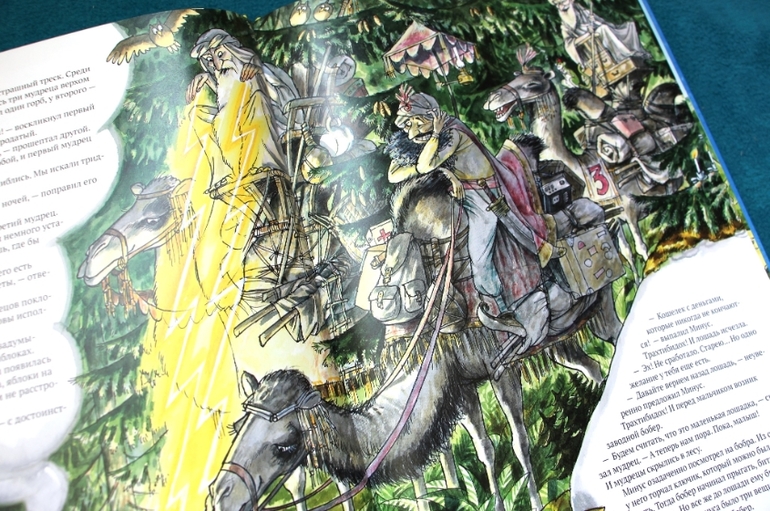 Тем не менее, хоть и перерос, а прочитал старший книгу с интересом, картинки долго рассматривал - ему очень понравилось проверять не ошибся ли художник с количеством предметов. Это очень забавная «фишечка»: каждый разворот посвящен цифре и всех изображенных предметов на картинке ровно столько, какая цифра тут фигурирует. Цифры ненавязчиво обыграны в тексте и очень навязчиво в иллюстрациях. Всегда есть изображение цифры. Оказалось весело пересчитывать нарисованных человечков, птичек, верблюдов, а еще грибы, огрызки, окна, домики, камушки, бутылочки, паруса, клевер, скворечники и еще много чего.