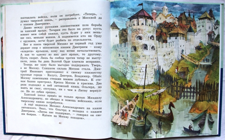 А какие иллюстрации! Каждая как отдельная история с множеством красок, персонажей, деталей. События и даже эмоции героев прорисованы очень искусно. Особенно сыну нравится рассматривать оружие.