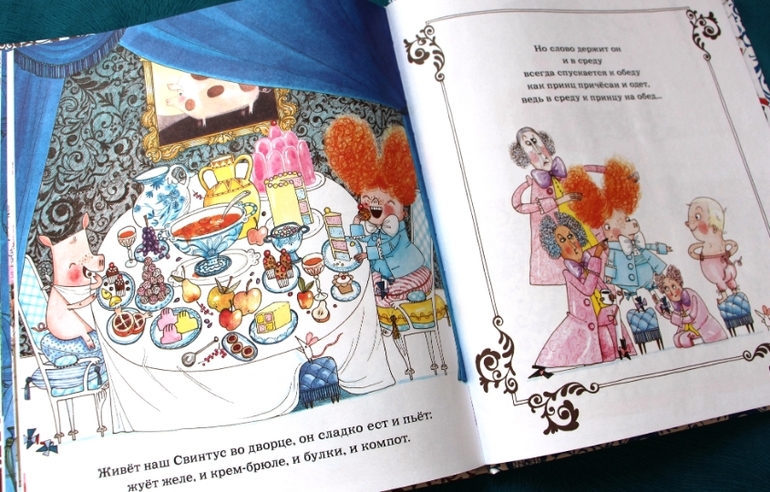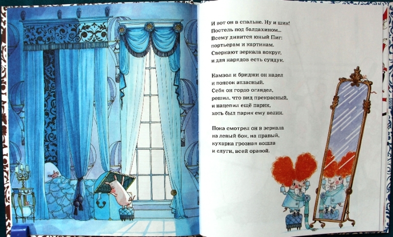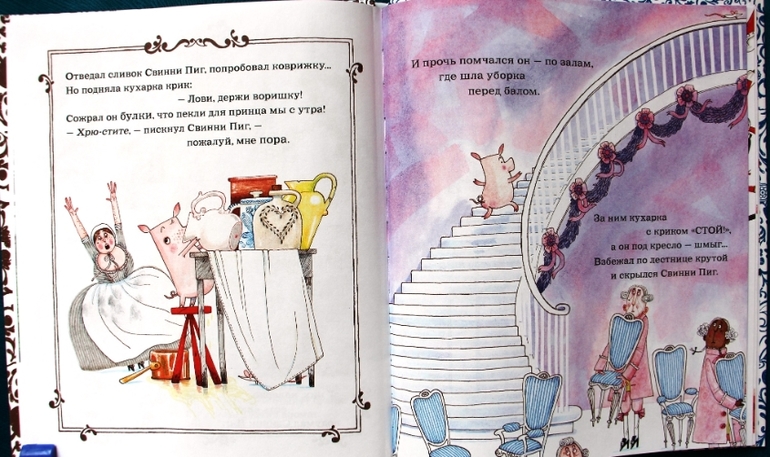 Стихотворение напоминает Маршака - легкие строки легко читаются, приятный ритм чтения и, главное, смешное. История длинная, смешная и с сюжетом: малыш Свинни Пиг случайно попал во дворец принца и, пока тот спал, от души повеселился и наелся. Когда все выяснилось, его хотели наказать, но принца так рассмешило, что его перепутали с поросенком, что он оставил его во дворце как своего двойника - Свинни теперь спасает принца от обеда с тетушкой-занудой.