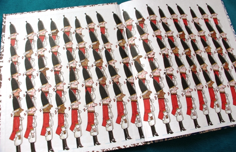 Внутри много-много иллюстраций и одно большое стихотворение на всю книгу: на некоторых разворотах по строчке, на других по 15 строк - строки размещены логично по смыслу и соответствуют иллюстрациям.