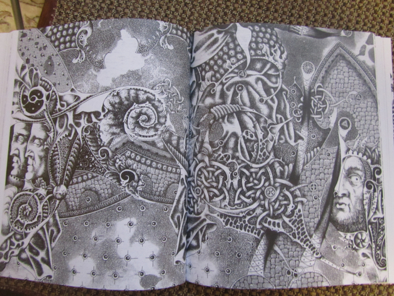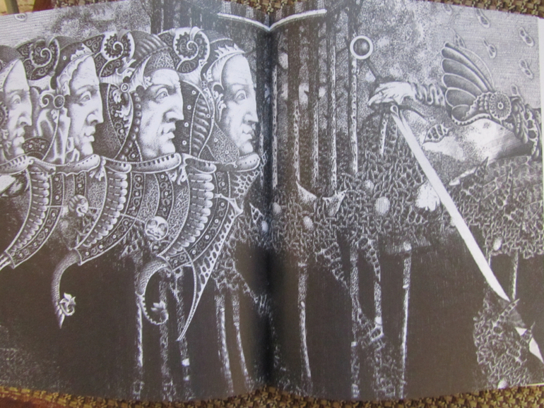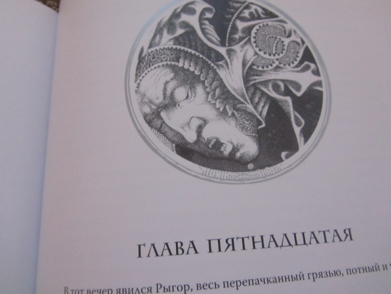 Книга большого формата, на мелованной бумаге (читать её на коленках где-нибудь будет неудобно, только за столом). Иллюстрации ч/б, очень своеобразные сюрреалистические такие, я может хотела бы более реалистичных, но и эти образы созданные художником тоже интересны.