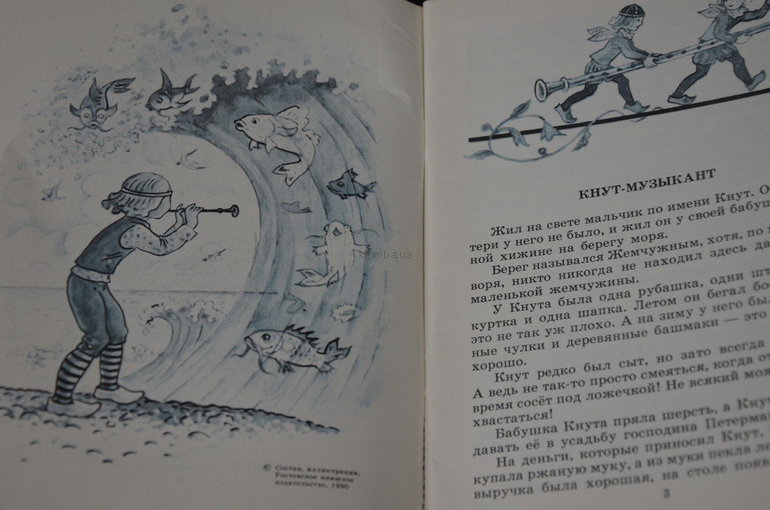 Знала эта дудочка целых три песенки, которые кого угодно могли заставить смеяться, плакать или спать. Только усыпил Кнут колыбельной песенкой рыбу, как налетели голодные птицы...