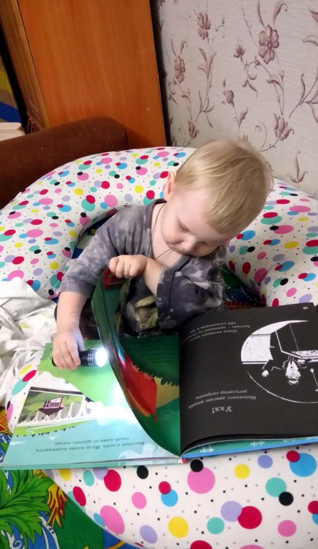 Эту книгу сынуля тоже "читает" в основном самостоятелльно: придёт, возьмёт фонарик, достанет книгу (у нас ещё есть про стройку, достаёт обе, но вторую смотрит редко) и садится смотрит:) Выглядит это вот так:)