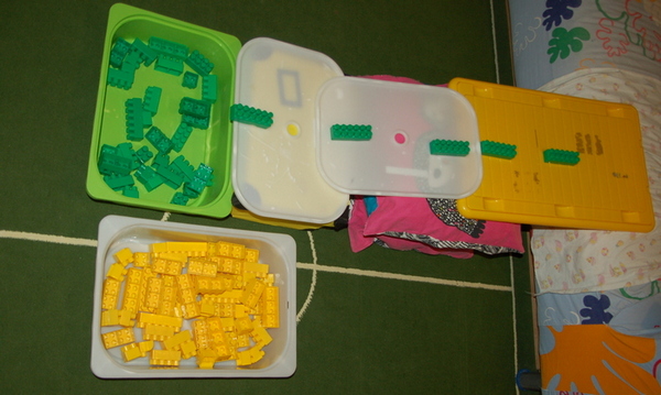 А вот недавно посмотрели производство Лего, сразу пошли из подручных средств соорудили транспортерную ленту, по которой двигались детальки одного цвета и падали в соотвествующие лотки ))