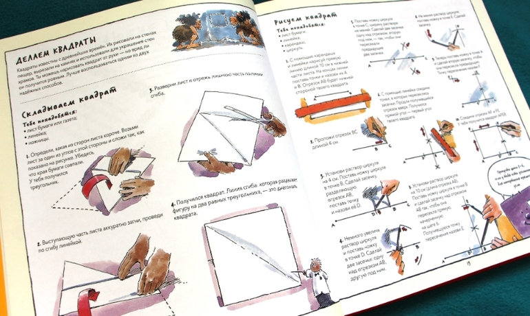 О каждой фигуре есть все: от описания и измерения, до головоломок и наблюдений в жизни. Перечислить не смогу все - на каждый вопрос до разворота отведено. Посмотрите на фото содержание - здесь только про квадраты. Много мастер-классов, заданий, опытов, головоломок.