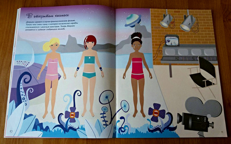В книге каждый разворот посвящен определенной теме и ему соответствует лист с наклейками. Кроме одежды есть различные аксессуары и элементы декора, иногда они остаются и дочка украшает ими свои рисунки.