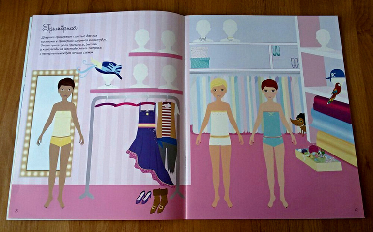 Мы обычно выдираем лист с наклейками, находим нужный разворот и дочка приступает к любимому занятию. Очень удобно, что незнакомые и специфичные предметы одежды подписаны, чтобы было легче разобраться что и куда клеить.