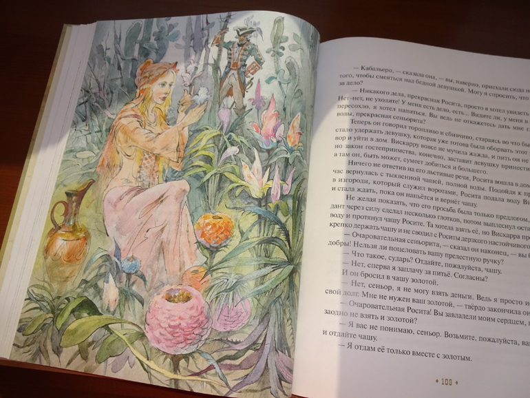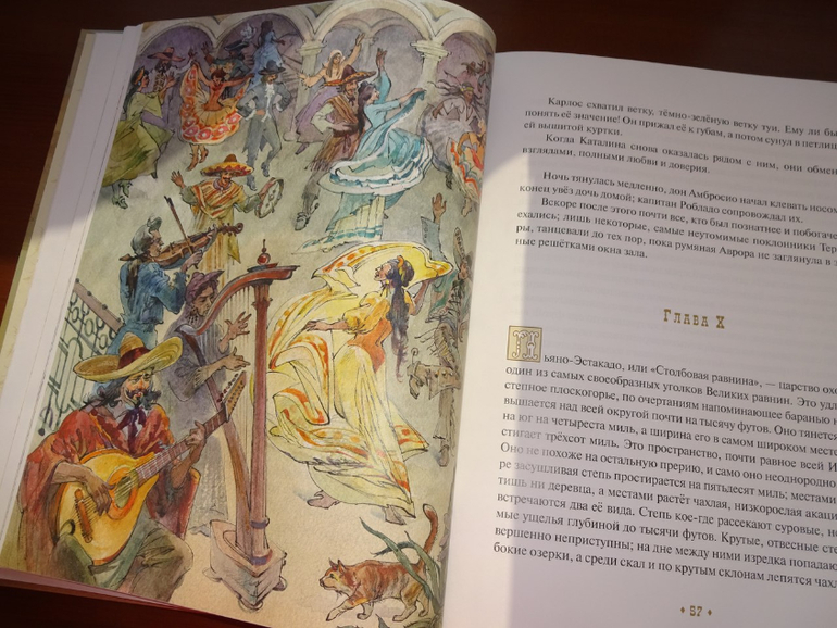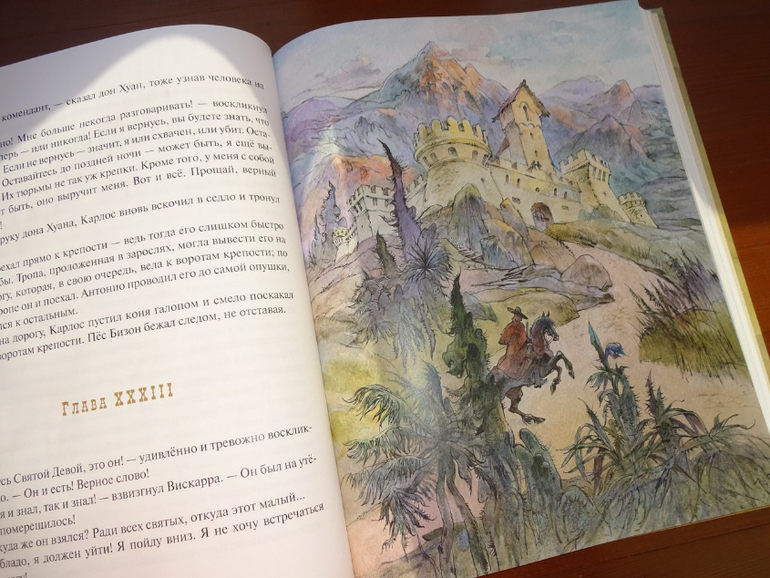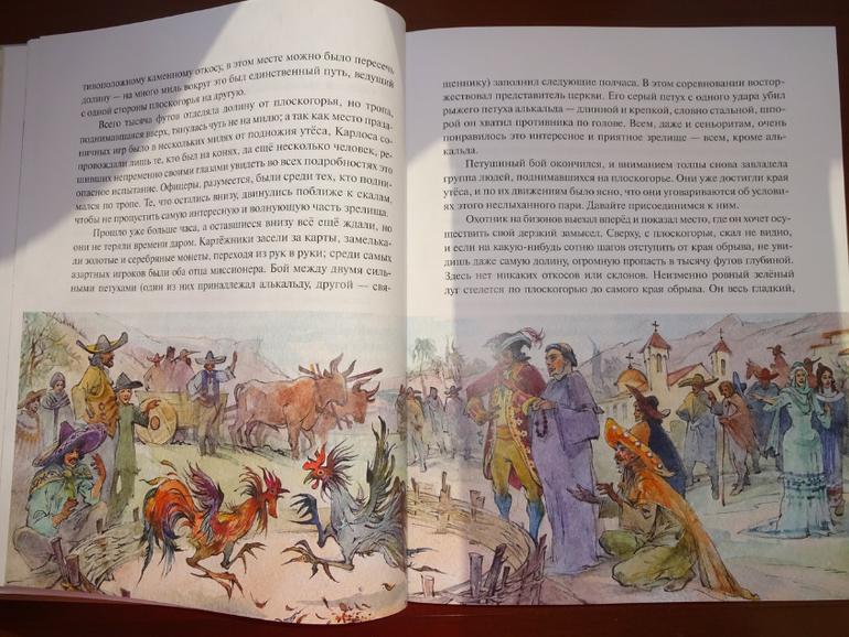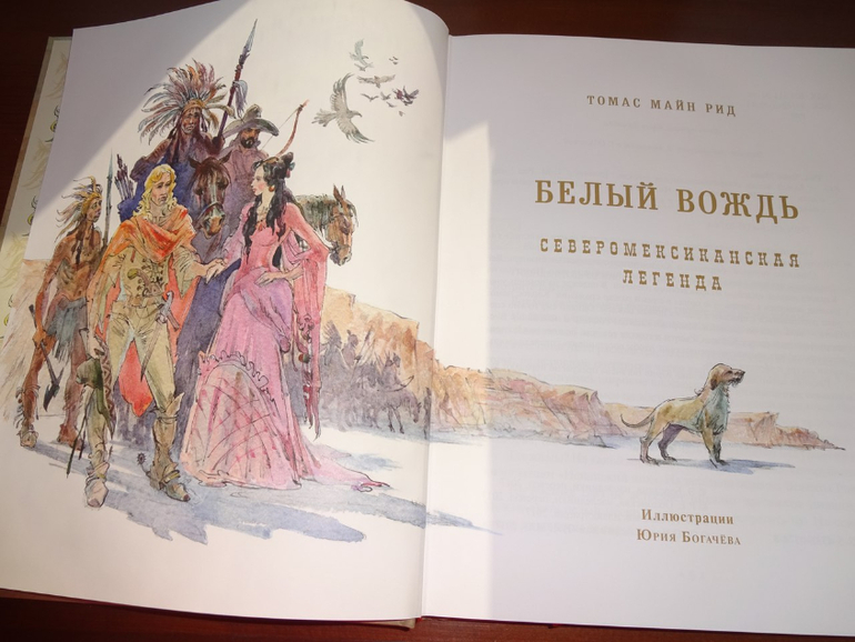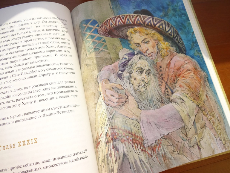 Мне и раньше нравились иллюстрации Юрия Богачёва к приключенческим книжкам, но здесь они просто роскошны: эта цветовая гамма, выразительные лица, говорящие позы... Не на каждом развороте, но в целом их довольно много, во всяком случае гораздо больше, чем во "Всаднике без головы" :-) Признаться, я пребываю под сильным впечатлением.