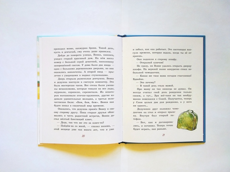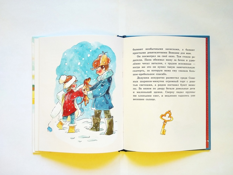 Нежные акварельные иллюстрации в желто-синих пастельных тонах, очень правдивые, с добрыми лицами и правильными пропорциями. Мне нравятся такие рисунки, невычурные, немультяшные, некарикатурные и не искажающие реальность и плоскости. На них смотришь - и живо представляешь себе всех героев книги, будто смотришь детский фильм. И как они подходят к рассказам Анны Доброчасовой! Такие же спокойные, теплые и сердечные.