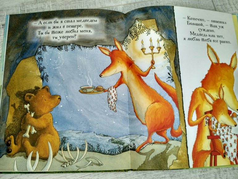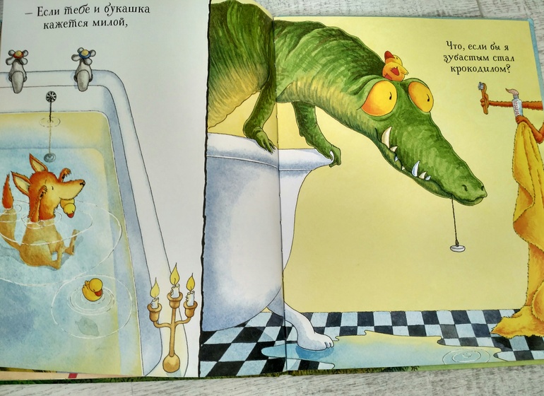 Очень нравятся мне иллюстрации, мы видим как малыш ужинает, чистит зубы, купается и при этом видим его предположения, как он стал медведем или букашкой.