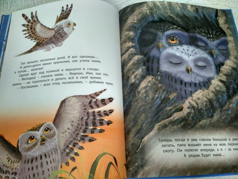 Сама книга очень красивая, нежные рисунки, милое семейство сов, необычная цветовая гамма. Совы ведь ночные жители, и в основном события происходят либо на рассвете, либо на закате.