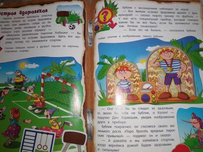 Одной из любимых книг с заданиями - "Три пирата плывут на остров Здоровяков" (Лабиринт). Ее перечитывали и просматриваем очень часто. Книга с наклейками, тоненькая, А4. Текст легко читается, плавно переходя в задание: