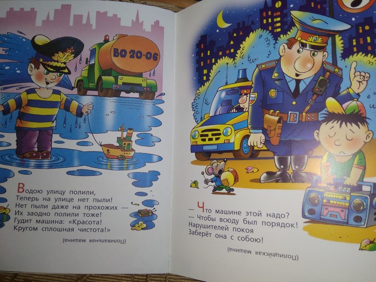 Немного о профессиях в стихотворной форме в книге "Про папу и маму" (АСТ-пресс), читаем также уже давно, что-то и наизусть знаем. Формат чуть меньше А4. Содержания нет. Профессий много: директор, механик, швея, археолог, врач, астроном и др. Единственный минус данного издания - на клею и начинает рассыпаться. Есть и прошитые экземпляры, к сожалению, узнала позже приобретения.