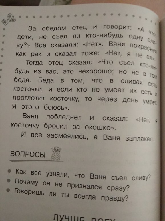 В ней собраны стихотворения классиков детской литературы, сказки, рассказы. По каждому произведению вопросы, которые можно задать ребенку. Так, например, был вопрос о подарках в нашей семье, ответ ребенка был неожиданным и интересным, взяли на заметку свои оплошности) Рассказ Льва Толстого "Косточка" меня смутил немного, с ребенком все ж обсудили, что можно было спросить, поинтересоваться "Как это называется, как ее кушают", сесть вместе со всеми, от косточки не умрет маленький.