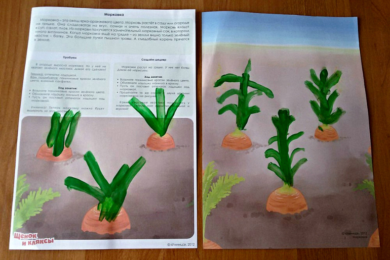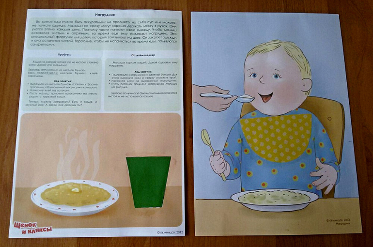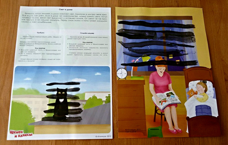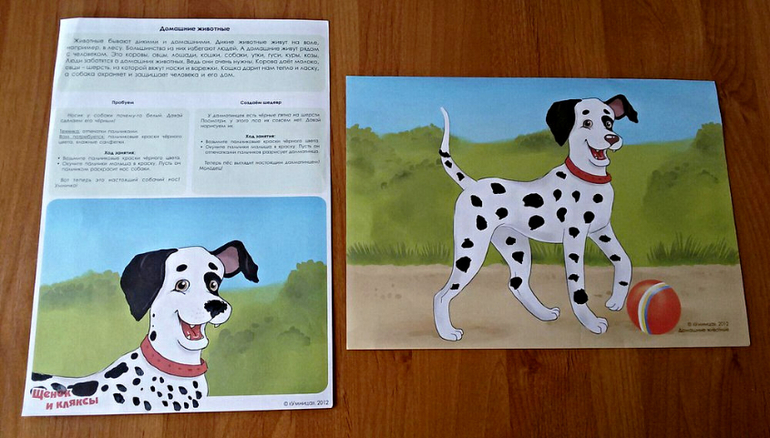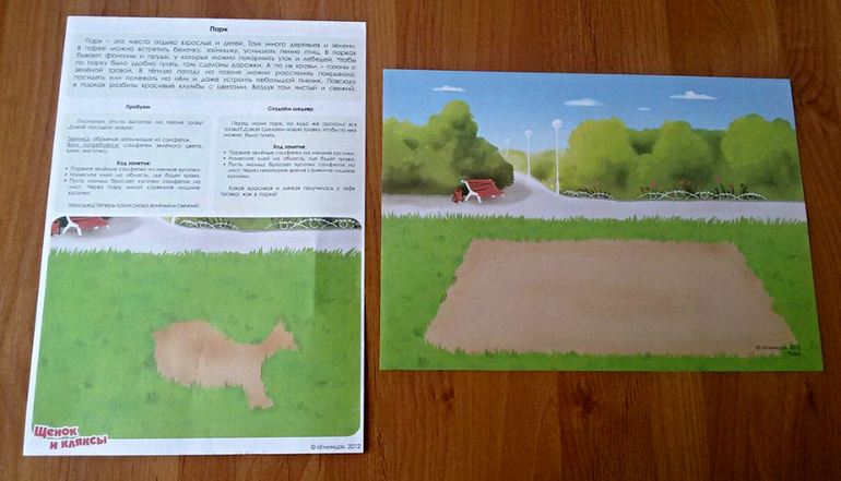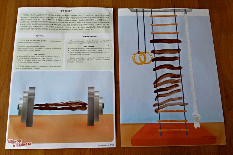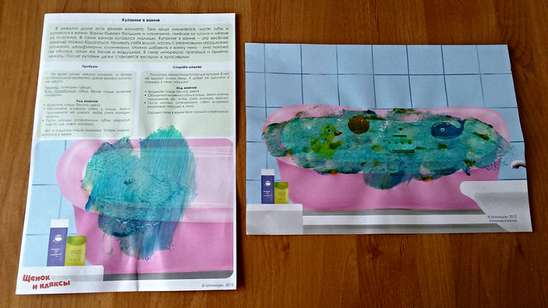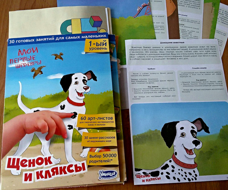 На арт-листах описаны занятия по рисованию, аппликации и лепке. Производитель предлагает заниматься по ним уже с ребенком девяти месяцев, но у нас подобные занятия пошли только после двух лет. Пока мы осилили только первый уровень, который называется "Щенок и кляксы". Он познакомит малыша с самыми простыми техниками: отпечатки ладошкой, рисование пальчиками, создание лепешек из пластилина, обрывная аппликация, кляксы кисточкой.