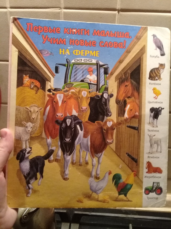 У нас было несколько книг, картонных, из серии "Найди и покажи". Были книги про питомцев, автомобили, дорожные знаки - картинка на три четверти страницы и четверостишие под ней.