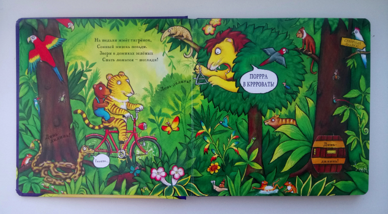 Например, картина на стене детской, где тигренок везет на велосипеде медвежонка, а на полу книга(или альбом для рисования), где на обложке те же персонажи в зелене листвы...). А теперь посмотрим первый разворот...
